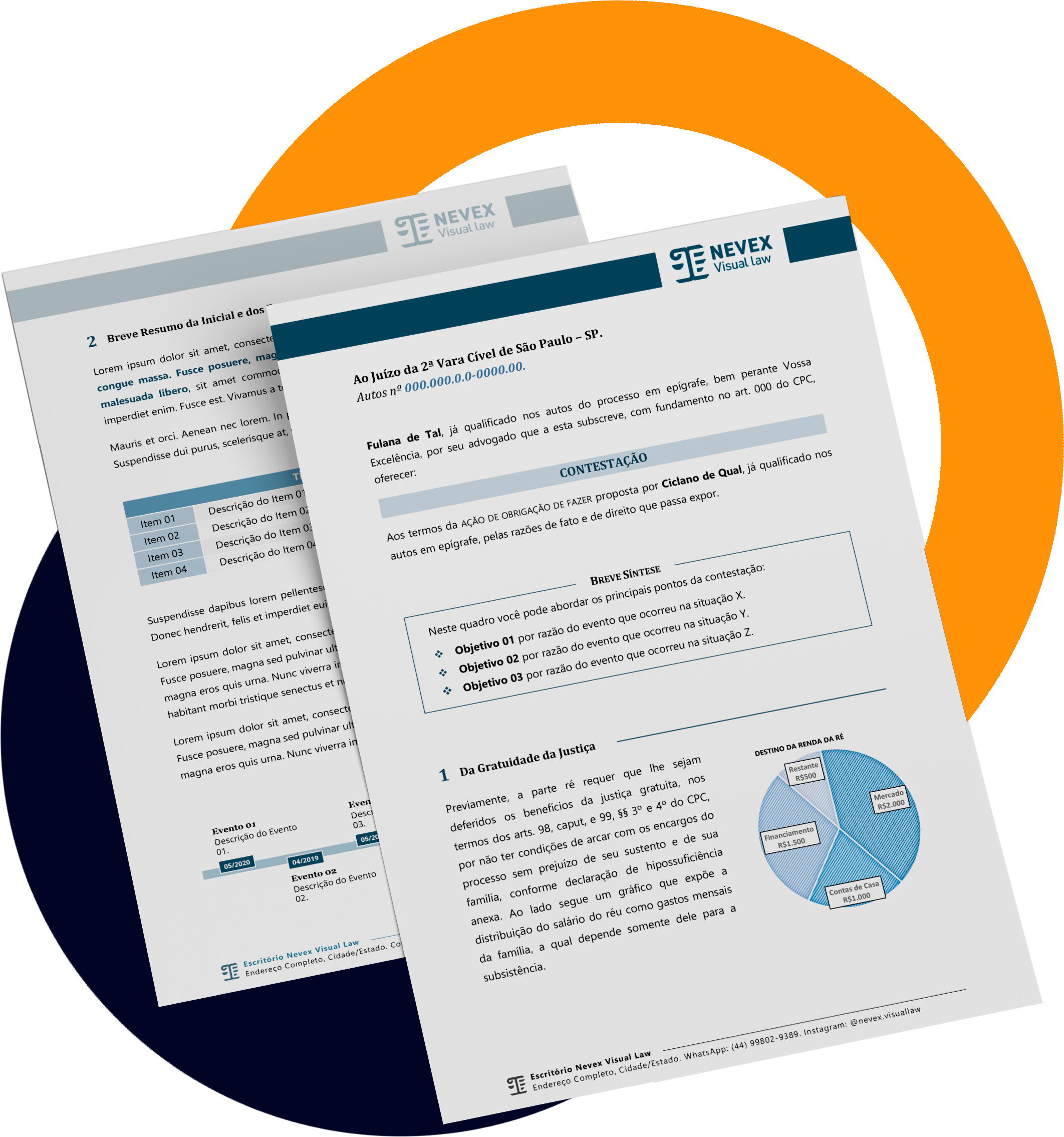 O Nevex Visual Law transforma documentos jurídicos (petições, contratos, propostas) em materiais estratégicos, persuasivos e de fácil leitura, potencializando suas chances de sucesso através da formatação, com técnicas de Visual Law e Legal Design.